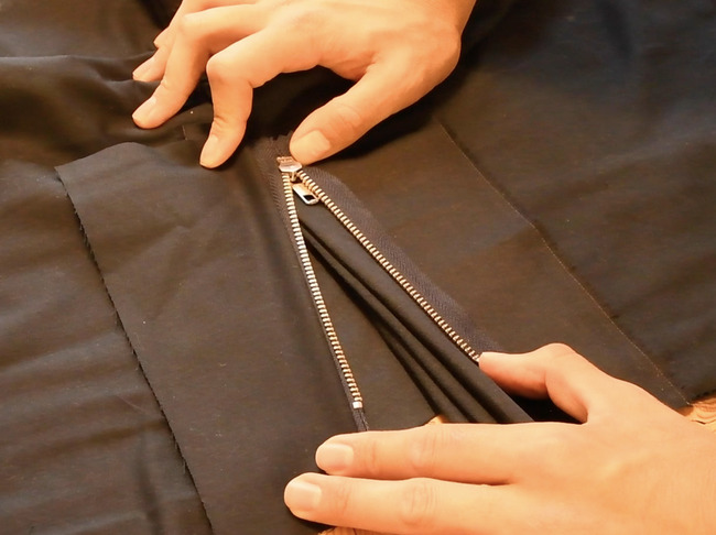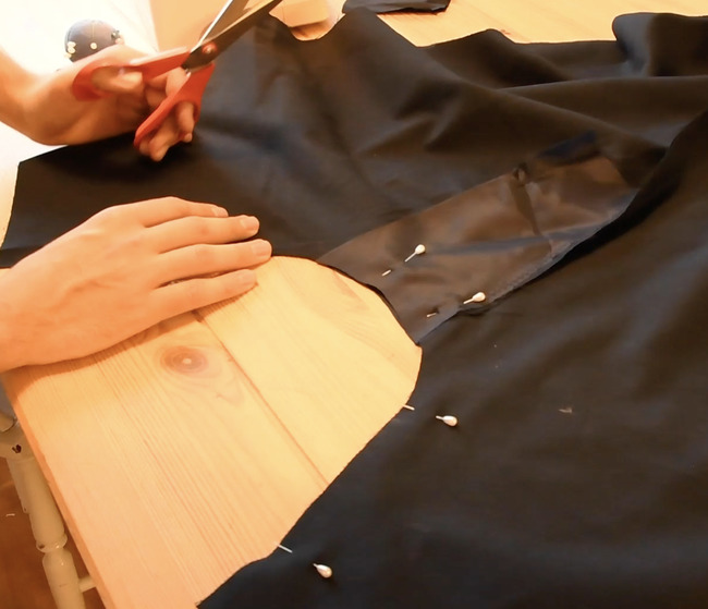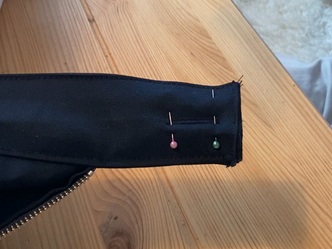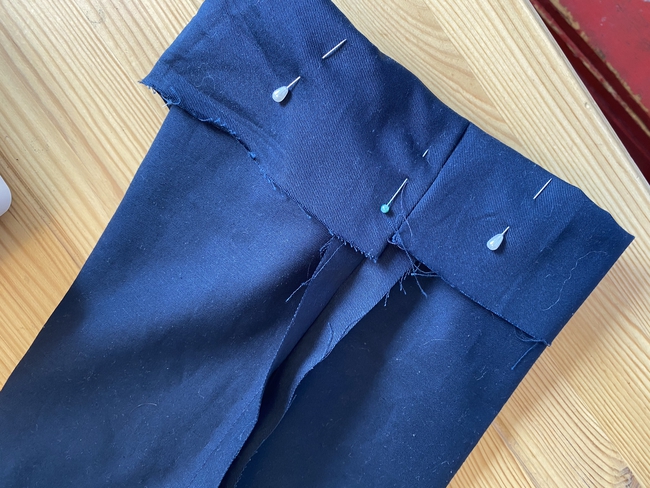 För att byxorna ska “krama om” midjan bättre brukar man knipa in översta delen av byxorna. På två ställen fram och två ställen bak. Enklast här återigen är att ta på dig byxorna ut och in. Knip in och sätt fast knappnålar för att känna av. När du känner dig nöjd så syr du en enkel raksömn ner längs knappnålarna.