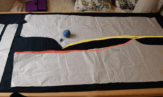 De rött markerade delarna av bilden är tygpartier för ficköppning och för gylfen.