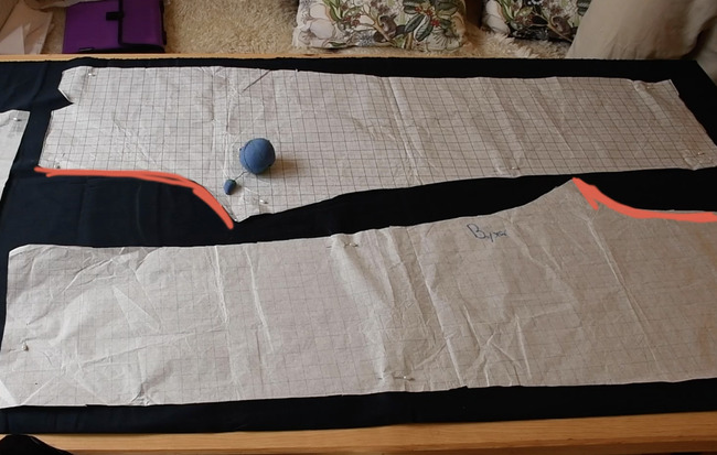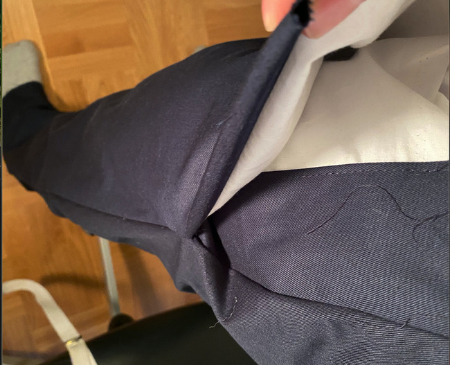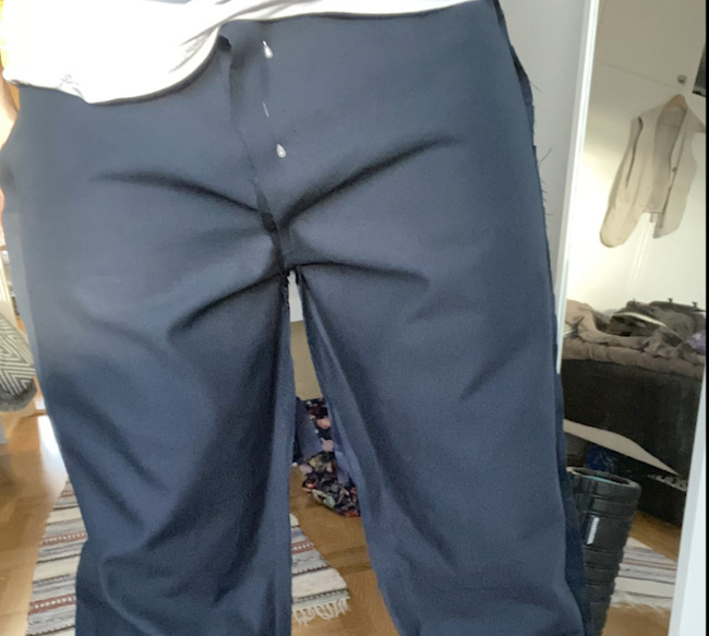 För min senaste modell har jag lagt till en bit glatt tyg vid insida skrev. Detta för att minska friktion och se till att slitningar där minskar. Det här är ett experiment då mina byxor brukar gå sönder just där. Jag vet inte hur man gör i normala fall, men i tygbutiken fick jag tipset att fodra allt tills halvvägs ner för låren. Jag testar nu den här snålvarianten med en liten bit och återkommer hur det går!