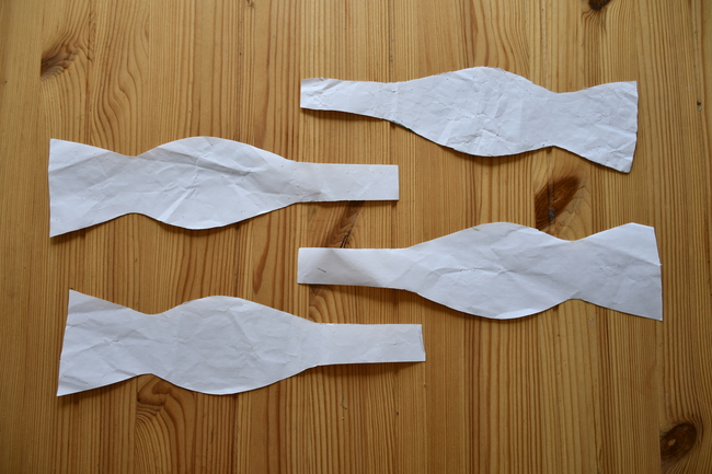 Utifrån mallen behöver du 4 bitar av tyget. Två för högersida av flugan och två för vänstersidan. Utöver det behöver du 2 bitar från mellanlägget för att ha på insidan.