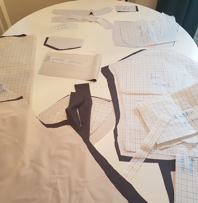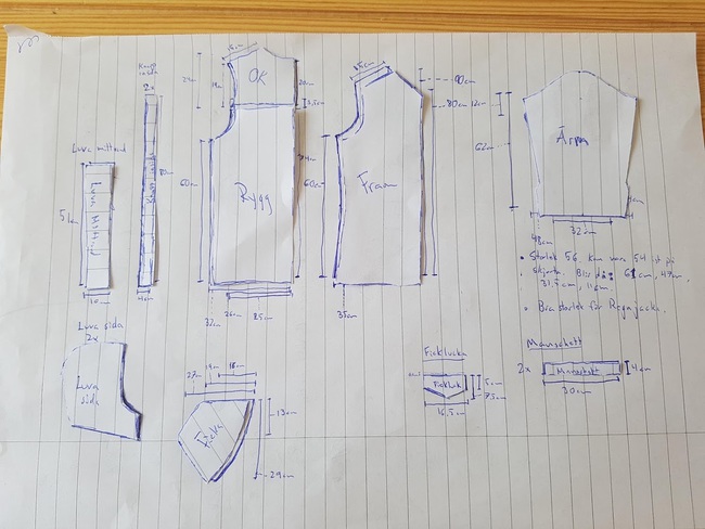 Jag hann inte dokumentera själva sy-processen, men här är bilder på hur jag planerade alla bitar. Vill du veta hur man syr en jacka kan du kika in guiden Sy en trenchcoat. Liknande steg, bortsett från att regnjackan inte har foder och istället för krage har den en luva.