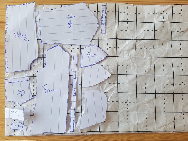 Här kan vi se hur jag planerade klippa ut bitarna. Genom att optimera hur jag lade bitarna behövde jag bara använda 2.25 meter tyg.
