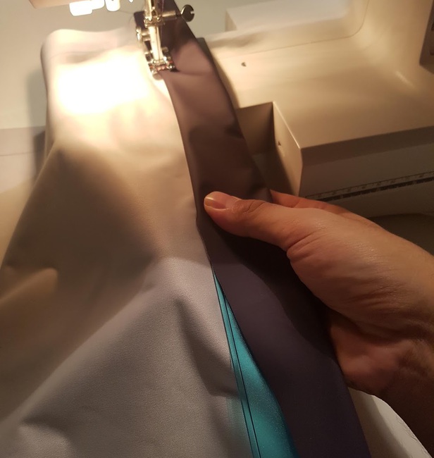 Jag var rädd för att använda knappnålar när jag skulle sy in knappremsan längs framsidan. Tyget hade svårt att ligga still, så jag använde en linjal som stöd för att vika in tyget och hålla det på plats.